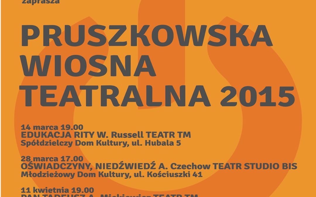 W tym roku Pruszkowska Wiosna Teatralna zorganizowana pod auspicjami Prezydenta Pruszkowa Jana Starzyńskiego, rozpocznie się spektaklem „Edukacja Rity” Willego Russella w sali widowiskowej Spółdzielczego Domu Kultury (ul. Hubala 5). Zapraszamy już 14 marca 2015 roku o godzinie 19.00.